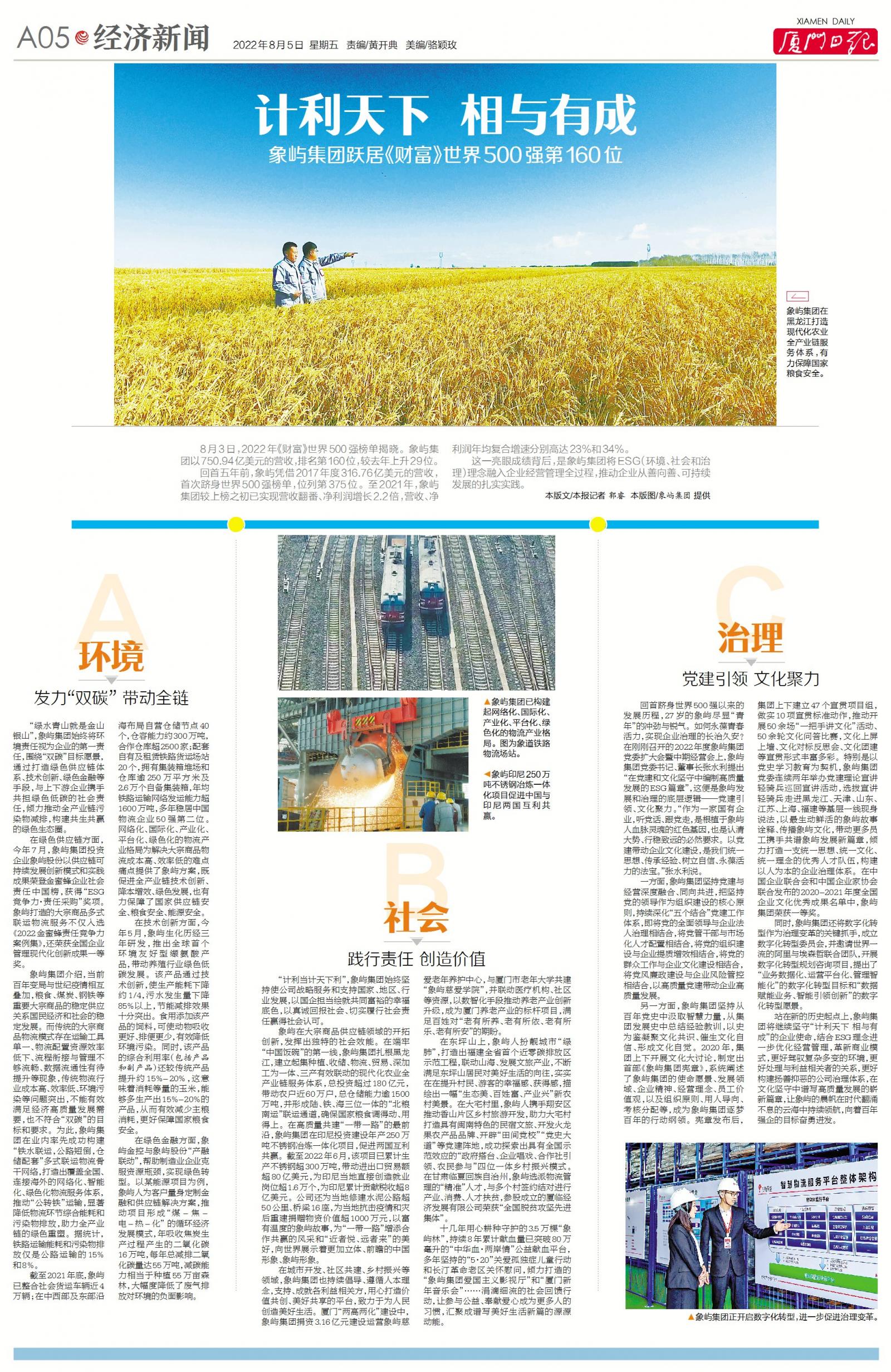 8月3日,2022年《財(cái)富》世界500強(qiáng)榜單揭曉。象嶼集團(tuán)以750.94億美元的營(yíng)收,排名第160位,較去年上升29位。