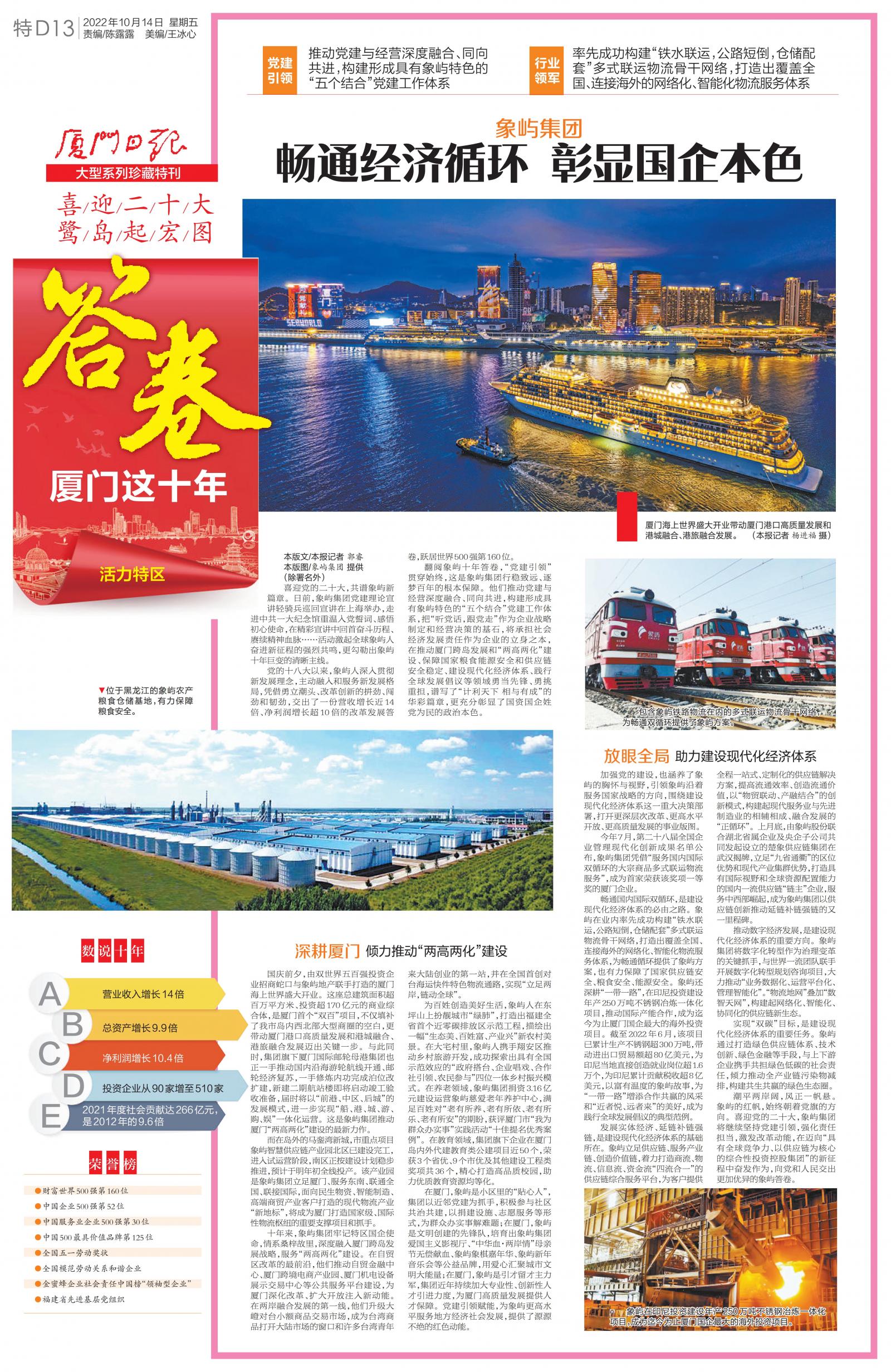 編者按:這10年,我們始終沿著習近平總書記指引的方向奮勇向前;這10年,我們奮力書寫高質(zhì)量發(fā)展亮麗答卷。今天,廈門日報推出大型系列特刊《喜迎二十大 鷺島起宏圖 答卷·廈門這十年》,專版報道象嶼集團堅持黨建引領(lǐng),深耕廈門傾力推動“兩高兩化”建設(shè),放眼全局助力建設(shè)現(xiàn)代化經(jīng)濟體系的精彩答卷?,F(xiàn)全文轉(zhuǎn)載如下。