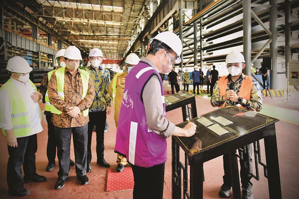 ▲印尼總統(tǒng)佐科視察象嶼印尼項目并在鑲有公司產品的石牌上簽字留念