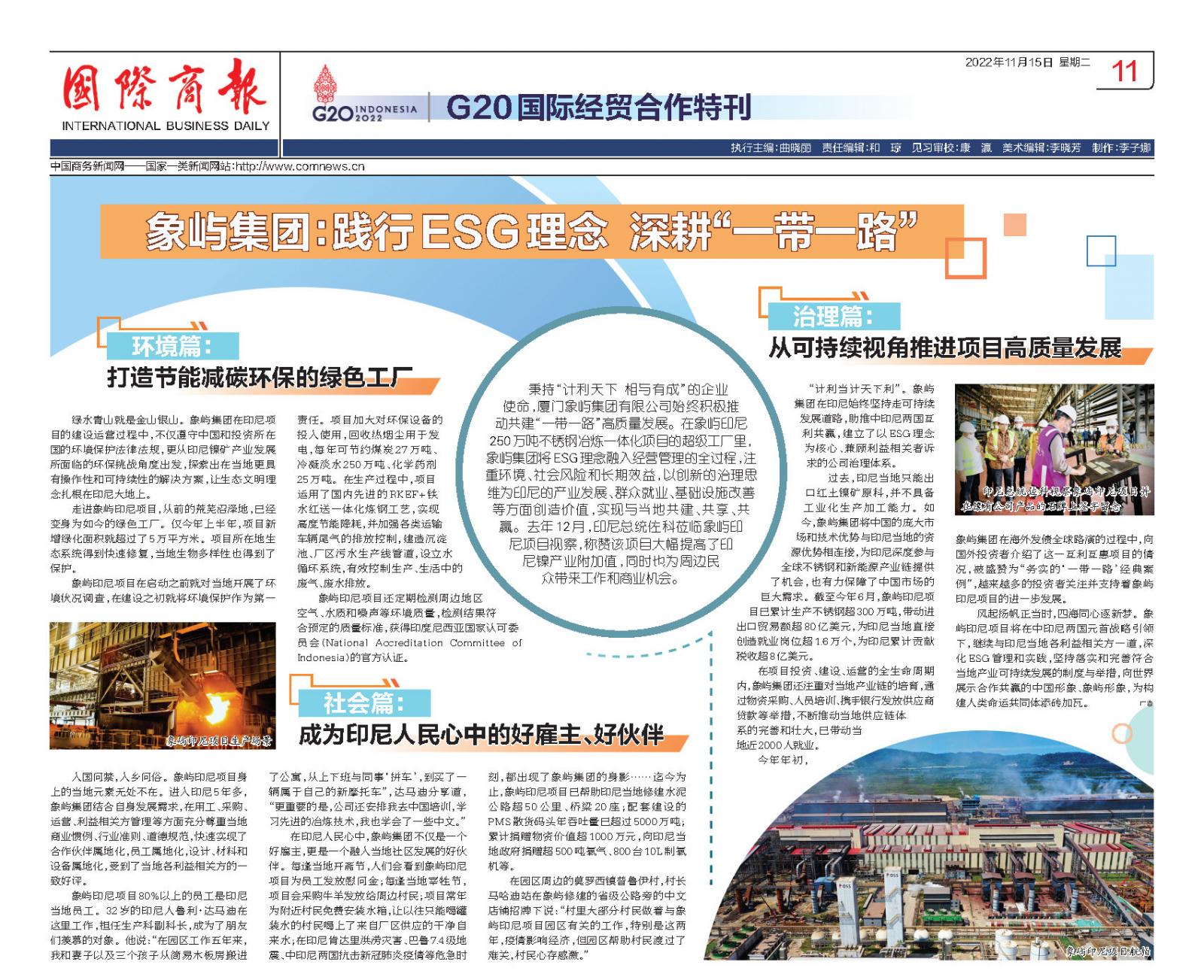 習近平主席近日出席二十國集團領導人第十七次峰會,這是黨的二十大勝利召開后,中國最高領導人首次出席多邊峰會。值此之際,商務部《國際商報》推出《G20國際經貿合作特刊》,專版報道象嶼集團作為中國國有企業(yè)出海、深耕“一帶一路”的典型代表,積極踐行ESG理念,為促進產業(yè)鏈供應鏈穩(wěn)定、人民福祉增加和社會文明進步注入象嶼力量的生動實踐,現(xiàn)全文轉載如下。