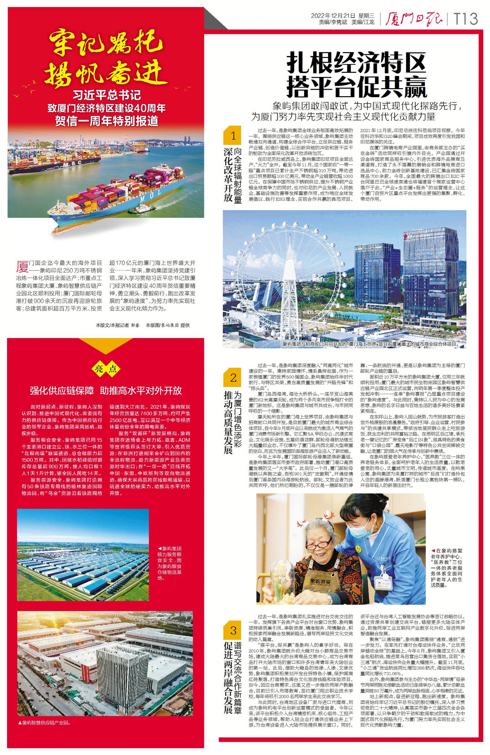 廈門國企迄今最大的海外項(xiàng)目——象嶼印尼250萬噸不銹鋼冶煉一體化項(xiàng)目全面達(dá)產(chǎn);市重點(diǎn)工程象嶼集團(tuán)大廈、象嶼智慧供應(yīng)鏈產(chǎn)業(yè)園北區(qū)順利投用;廈門國際郵輪母港打破900余天的沉寂再迎游輪旅客;總建筑面積超百萬方、投資超170億元的廈門海上世界盛大開業(yè)……一年來,象嶼集團(tuán)堅持黨建引領(lǐng),深入學(xué)習(xí)貫徹習(xí)近平總書記致廈門經(jīng)濟(jì)特區(qū)建設(shè)40周年賀信重要精神,勇立潮頭、勇毅前行,跑出改革發(fā)展的“象嶼速度”,為努力率先實(shí)現(xiàn)社會主義現(xiàn)代化傾力作為。今天,廈門日報推出特刊《牢記囑托 揚(yáng)帆奮進(jìn) 習(xí)近平總書記致廈門經(jīng)濟(jì)特區(qū)建設(shè)40周年賀信一周年特別報道》,現(xiàn)全文轉(zhuǎn)載如下。
