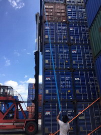 集裝箱堆積起來有20多米高,臺風中,堆箱的穩(wěn)固性就顯得尤為重要。廈門、福州兩地的堆場早在前兩天就著手相關(guān)加固防護工作。8日白天,又有工作人員迎著大風爬上樓頂檢查加固鋼架,不到臺風來臨,時刻也不掉以輕心。