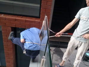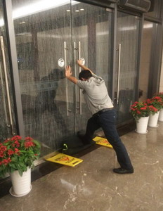 王志富是臺風(fēng)登陸當(dāng)晚象嶼高尚物業(yè)公司留下值守的54位員工中的一個,他負(fù)責(zé)國際航運(yùn)中心D棟的安全。D棟處于風(fēng)口位置。凌晨2點多,風(fēng)大作,雨加急,那聲勢猶如排山倒海,讓這位魁梧的大漢也是心驚。眼看防汛沙袋做的大門加固也無法阻擋風(fēng)雨的侵入,他不顧只身一人,奮力頂住玻璃大門?!耙坏┯晁嗳氪筇茫魅腚娞菥?,后果不堪設(shè)想!”聞訊趕來增援的4位值守人員也都撲上來用力頂住大門,五人使足了勁,一個多小時后,風(fēng)力減弱,他們以堅定的意志戰(zhàn)勝了狂暴的臺風(fēng),玻璃門沒有倒下,D棟安全了!