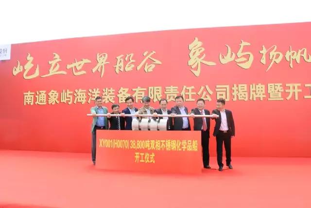 首制船“XY001”號(hào)38800噸不銹鋼化學(xué)品船同期開工。江蘇省經(jīng)信委副主任、國防科工委主任秦雁,南通市委常委、通州區(qū)委書記宋樂偉,南通市副市長徐新民,通州區(qū)區(qū)委副書記、區(qū)長陳永紅,華融航運(yùn)金融租賃有限公司總經(jīng)理樊旭平,象嶼集團(tuán)總裁陳方,中海重工董事局主席李明,南通象嶼副董事長朱建華,共同推動(dòng)38800噸不銹鋼化學(xué)品船開工桿!