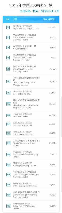 7月31日,《財富》(中文版)發(fā)布了2017年“中國500強”排行榜,象嶼股份位列57位,較上一年度前進41位。在同時發(fā)布的行業(yè)榜單中,象嶼股份位列交通運輸、物流、倉儲業(yè)行業(yè)子榜單第1位。