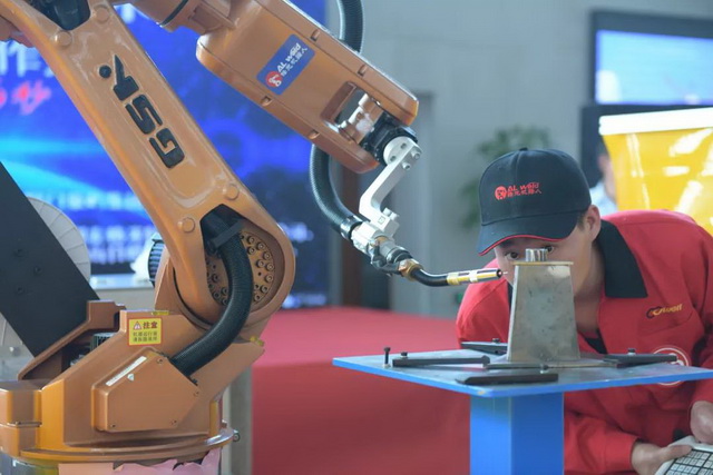 分組焊接工件,機(jī)器人編程示教,實(shí)地焊接……參賽選手們一絲不茍,眼力、手力、腦力并行,電光火石間閃爍著大國工匠的認(rèn)真、專業(yè)和敬業(yè)。
