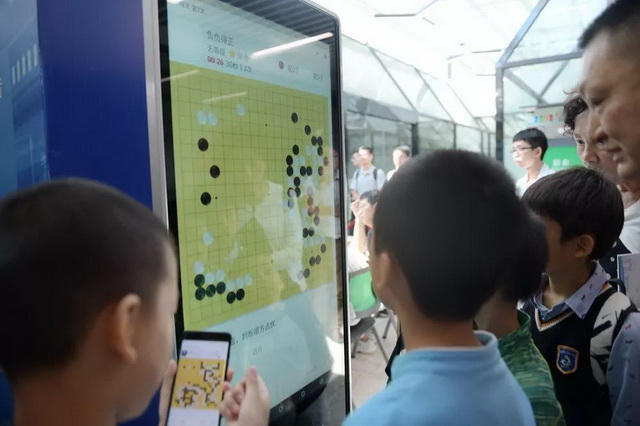 圍在一旁的圍棋小愛好者們摩拳擦掌,輪流在一旁圍棋互動屏熱身,準備進場挑戰(zhàn)“棋智”!現(xiàn)場的圍棋圖書和人工智能圍棋閱覽交流區(qū)也熱鬧非凡。