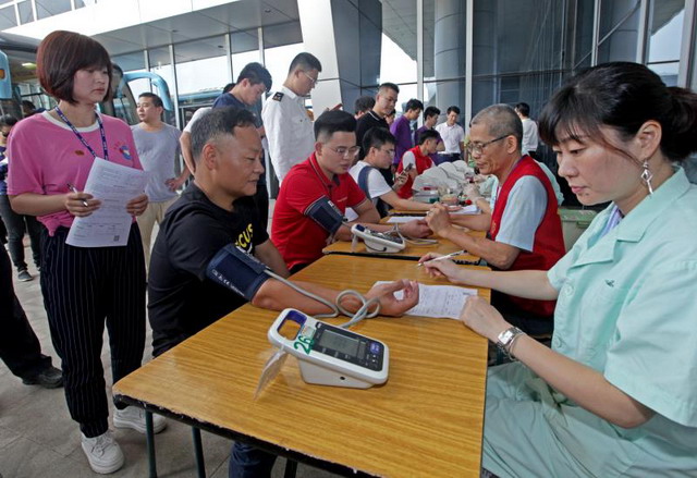 現(xiàn)場(chǎng)志愿者排隊(duì)登記獻(xiàn)血。