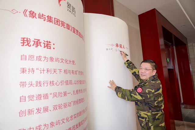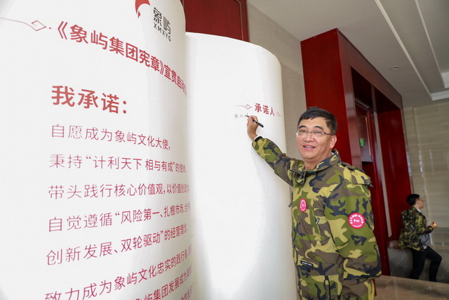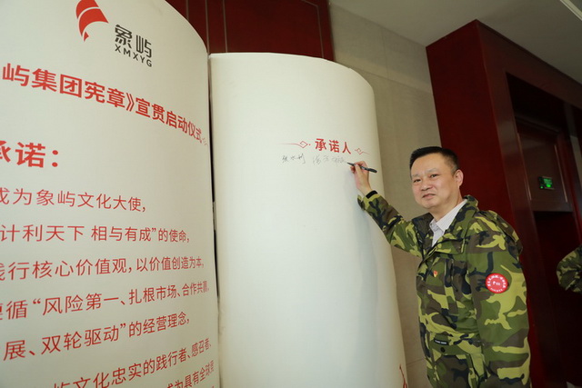 在《象嶼集團(tuán)憲章》宣貫啟動(dòng)儀式上,121名象嶼文化大使鄭重承諾:“我自愿成為象嶼文化大使,秉持‘計(jì)利天下 相與有成’的使命,帶頭踐行核心價(jià)值觀,以?xún)r(jià)值創(chuàng)造為本,自覺(jué)遵循‘風(fēng)險(xiǎn)第一、扎根市場(chǎng)、合作共贏、創(chuàng)新發(fā)展、雙輪驅(qū)動(dòng)’的經(jīng)營(yíng)理念,致力成為象嶼文化忠實(shí)的踐行者、感召者、傳播者,為把象嶼集團(tuán)發(fā)展成為具有全球競(jìng)爭(zhēng)力、以供應(yīng)鏈為核心的綜合性投資控股集團(tuán)而努力奮斗!”