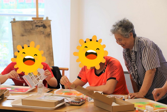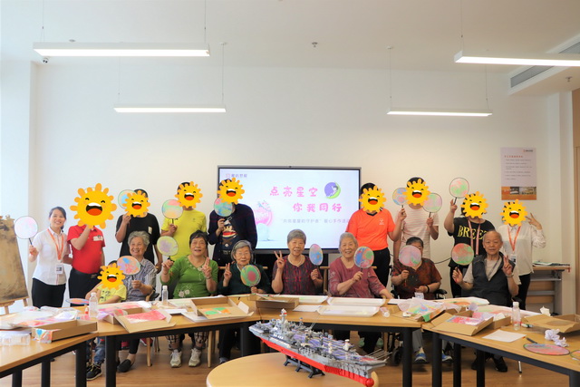 5月9日,在象嶼慈愛(ài)老年養(yǎng)護(hù)中心,長(zhǎng)者們與“星寶”親密互動(dòng),共同完成精美的濕拓畫手工扇作品。