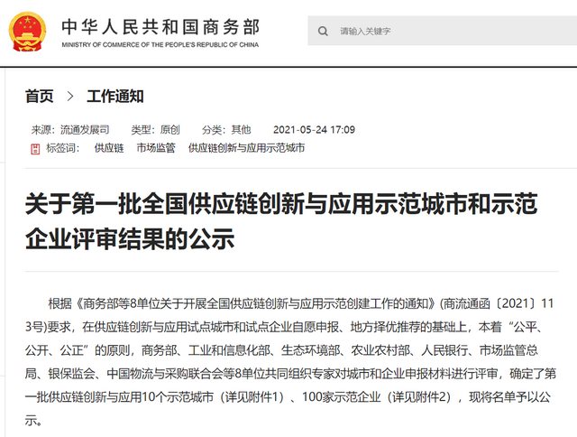 商務部此次公示的“全國供應鏈創(chuàng)新與應用示范城市和示范企業(yè)評審結(jié)果”,是商務部、工業(yè)和信息化部、生態(tài)環(huán)境部、農(nóng)業(yè)農(nóng)村部、人民銀行、市場監(jiān)管總局、銀保監(jiān)會、中國物流與采購聯(lián)合會等8單位共同組織專家對城市和企業(yè)申報材料進行評審確定的結(jié)果。