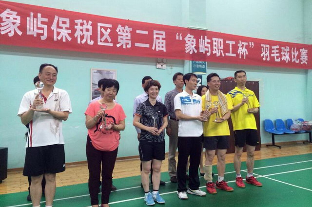 由集團(tuán)公司胡秋云、傅根海和象嶼建設(shè)集團(tuán)陳炳忠3人組成的集團(tuán)公司代表隊(duì),從27支參賽隊(duì)伍、6個(gè)小組中以小組第一名的成績(jī)進(jìn)入復(fù)賽,并在循環(huán)賽中同樣以第一名的成績(jī)挺入決賽,與象嶼海關(guān)代表隊(duì)展開最終的冠亞軍之爭(zhēng)。高遠(yuǎn)球、扣殺、劈殺、吊球,運(yùn)動(dòng)員在場(chǎng)上打得酣暢淋漓,觀眾們?cè)趫?chǎng)下享受視覺(jué)盛宴。經(jīng)過(guò)數(shù)輪緊張激烈的比拼,集團(tuán)公司代表隊(duì)最終以團(tuán)體總分第一的成績(jī)贏得象嶼保稅區(qū)第二屆“象嶼職工杯”羽毛球比賽第一名,象嶼保稅區(qū)黨工委陳章福副書記為集團(tuán)公司代表隊(duì)頒發(fā)獎(jiǎng)杯。這個(gè)獎(jiǎng)杯不僅是對(duì)運(yùn)動(dòng)員精湛球技的肯定,更是對(duì)他們所彰顯的健康向上的競(jìng)技風(fēng)貌、追求卓越的象嶼精神的褒獎(jiǎng)。同時(shí),速傳物流代表隊(duì)以細(xì)致周到的后勤保障、與組委會(huì)的良好互動(dòng)獲得“優(yōu)秀組織獎(jiǎng)”。