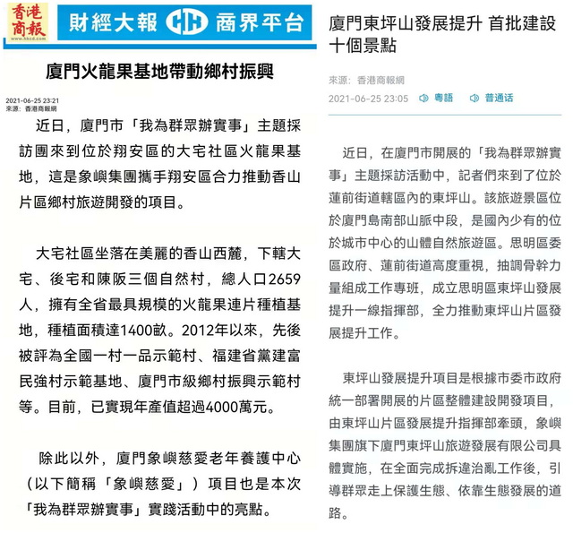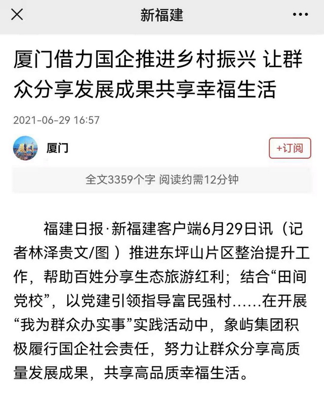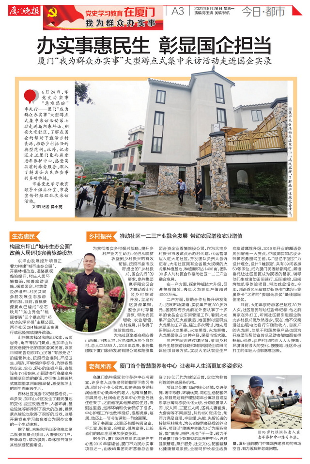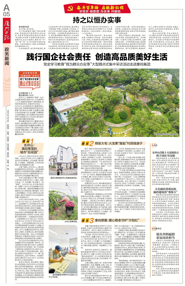 象嶼集團(tuán)正以“我為群眾辦實(shí)事”實(shí)踐活動(dòng)為抓手,深入學(xué)習(xí)貫徹習(xí)近平總書記重要講話精神,著力解決人民群眾急難愁盼問題,為百姓創(chuàng)造美好生活。近日,由廈門市委黨史學(xué)習(xí)教育領(lǐng)導(dǎo)小組辦公室、廈門市委宣傳部組織的黨史學(xué)習(xí)教育“我為群眾辦實(shí)事”大型蹲點(diǎn)式集中采訪走進(jìn)象嶼集團(tuán)。境內(nèi)外近20家媒體深入東坪山發(fā)展提升項(xiàng)目、大宅鄉(xiāng)村振興項(xiàng)目和象嶼慈愛老年養(yǎng)護(hù)中心,對(duì)象嶼集團(tuán)辦實(shí)事、解民憂、惠民生的創(chuàng)新舉措進(jìn)行集中報(bào)道。
