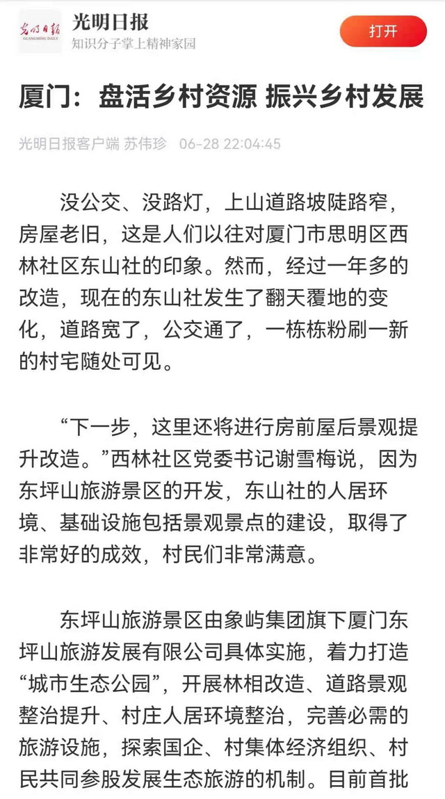 作為東坪山片區(qū)發(fā)展提升項(xiàng)目的具體實(shí)施方,象嶼集團(tuán)旗下廈門東坪山旅游發(fā)展有限公司貫徹“生態(tài)美,百姓富”的指導(dǎo)思想,一方面推動(dòng)村宅改造,一方面圍繞東山社“原鄉(xiāng)東山”的定位和東坪山社“文化東坪”的定位進(jìn)行產(chǎn)業(yè)植入。公司總經(jīng)理周遠(yuǎn)新介紹,村民可自愿選擇保留村宅或者下山安置,對(duì)保留村宅的村民,推動(dòng)老舊危房的改造提升,對(duì)下山安置后收回的村宅,則積極引入餐飲、住宿等業(yè)態(tài),提升旅游配套和產(chǎn)業(yè)造血功能。未來,公司將繼續(xù)探索國企、村集體經(jīng)濟(jì)組織、村民共同參股發(fā)展生態(tài)旅游的新機(jī)制、新模式。
