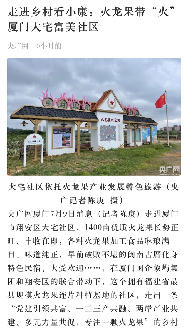 翔安大宅社區(qū)坐落于香山西麓,火龍果種植面積達(dá)1400畝,先后被評(píng)為全國“一村一品”示范村、福建省黨建富民強(qiáng)村示范基地、廈門市級(jí)鄉(xiāng)村振興示范村等。不過,種植火龍果的基地不少,為什么就“火”了翔安大宅?