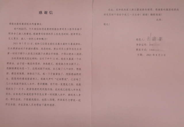 “感謝象嶼集團培養(yǎng)的好黨員、好干部給予我又一次生命!”8月2日上午,林先生將一面印有“治企有方干部優(yōu)秀 危難時刻英勇救人”的錦旗和一封感謝信送到象嶼集團,表達了他對象嶼集團員工彭華東的感激之情。8月3日出版的《廈門日報》也報道了這一救人義舉。