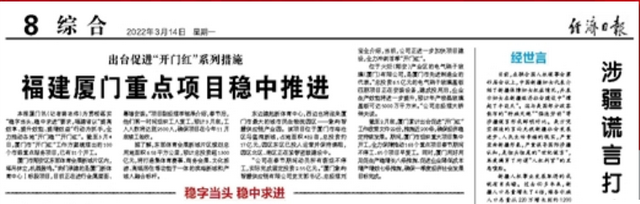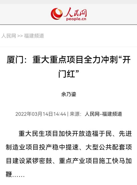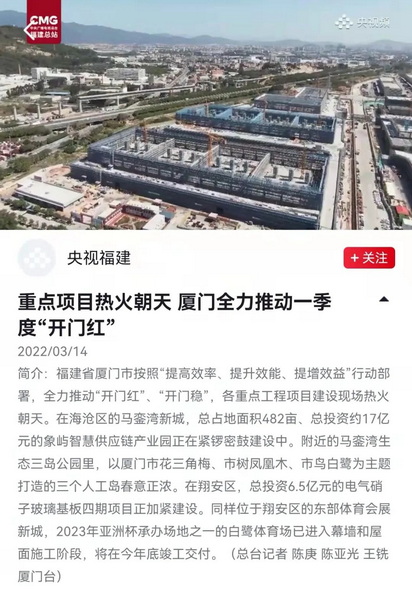 新華社以《廈門:一季度各重大項目平穩(wěn)運(yùn)行》為題,報道象嶼人今年的“快節(jié)奏”。
