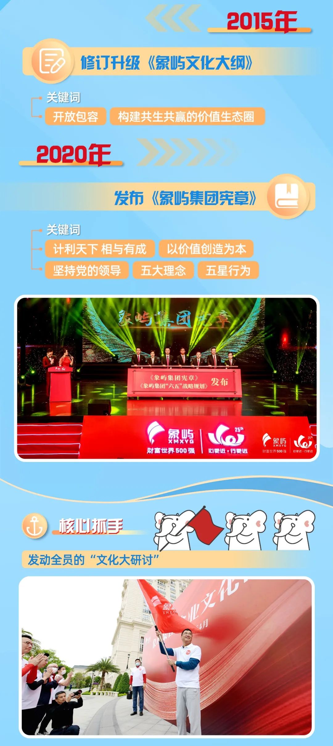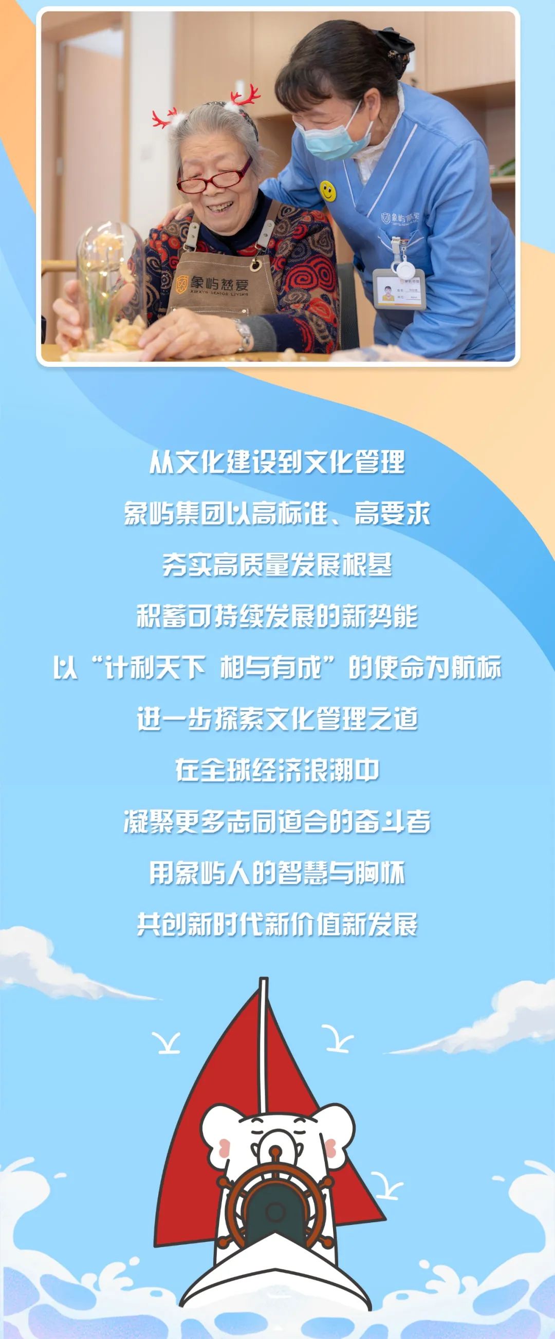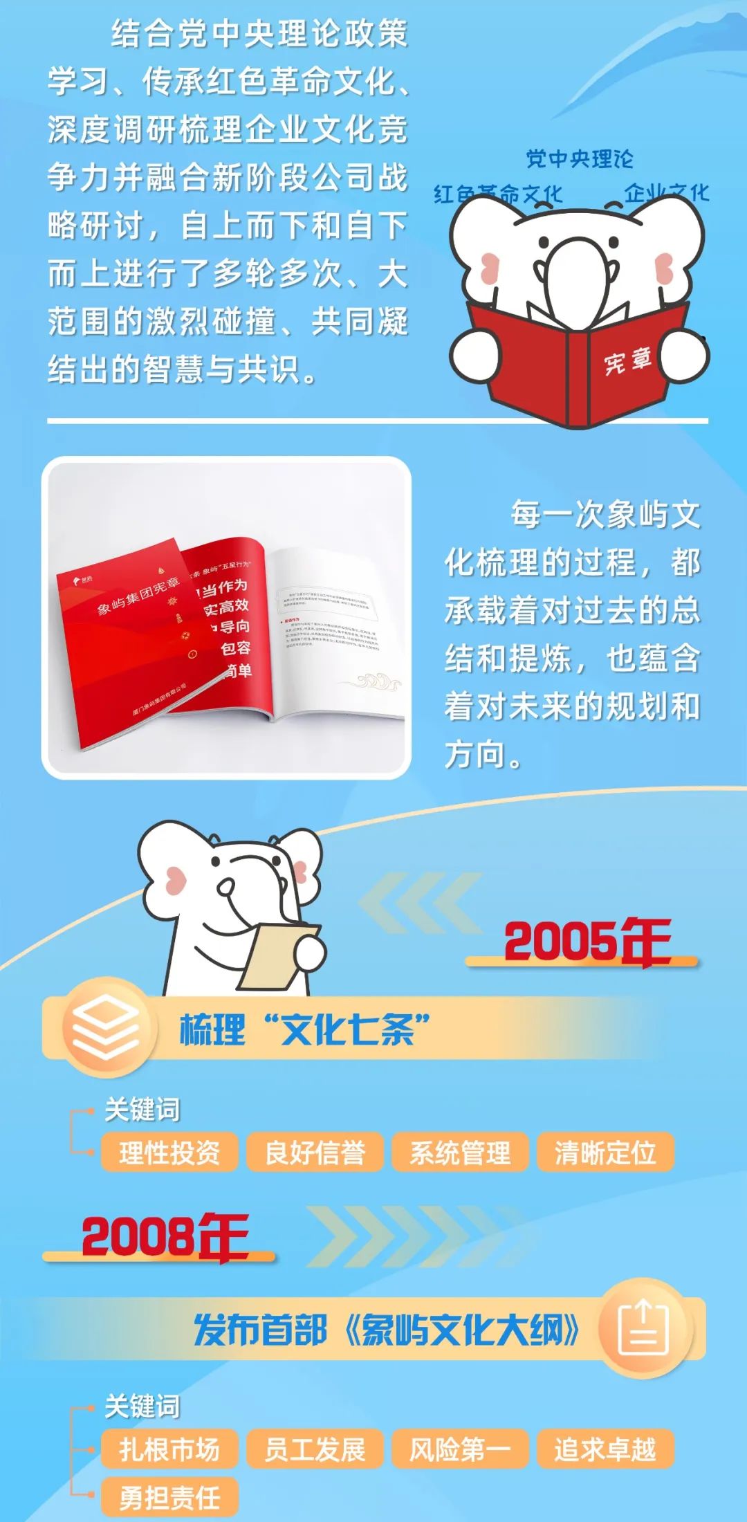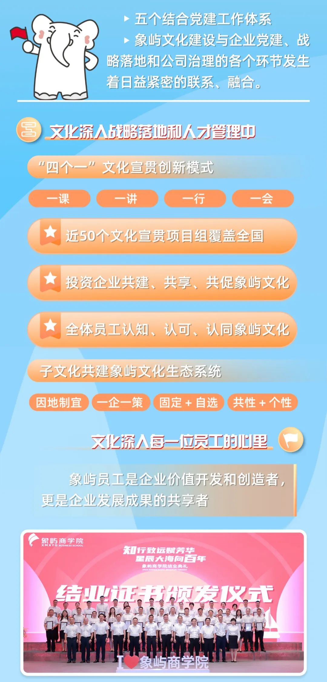 習(xí)近平總書記指出:“我們要堅(jiān)持道路自信、理論自信、制度自信,最根本的還有一個(gè)文化自信”“文化自信,是更基礎(chǔ)、更廣泛、更深厚的自信”。27年來,象嶼集團(tuán)始終堅(jiān)持黨的領(lǐng)導(dǎo),以創(chuàng)新開拓的特區(qū)精神投身于改革開放和市場經(jīng)濟(jì)的發(fā)展浪潮中,歷練出以堅(jiān)持市場化道路、堅(jiān)持風(fēng)險(xiǎn)第一等為核心的、蘊(yùn)含海洋基因的特色企業(yè)文化,為企業(yè)高質(zhì)量發(fā)展筑牢根基,提供強(qiáng)有力的精神動(dòng)能。