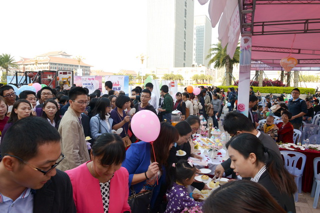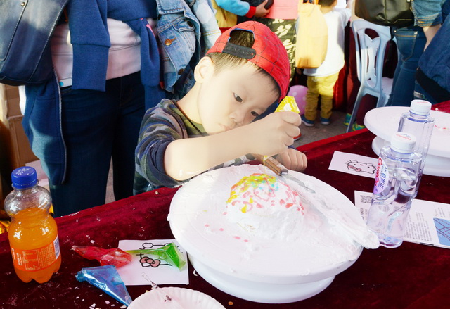 在這喧囂熱鬧中,有一個(gè)地方排起了一溜長(zhǎng)隊(duì)。這里就是食品區(qū)了,吃貨們?cè)缫驯贿@琳瑯滿目的飲料,小巧精致的甜品惹得食指大動(dòng)啦~吃了享受美食,精心設(shè)置的蛋糕DIY環(huán)節(jié),也讓大朋友、小朋友興奮不已,抹奶油、裱花、畫糖漿,雖然是第一次做蛋糕,卻全神貫注,細(xì)致入微,一招一式頗有章法。
