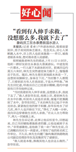 “感謝象嶼集團培養(yǎng)的好黨員、好干部給予我又一次生命!”8月2日上午,林先生將一面印有“治企有方干部優(yōu)秀 危難時刻英勇救人”的錦旗和一封感謝信送到象嶼集團,表達了他對象嶼集團員工彭華東的感激之情。8月3日出版的《廈門日報》也報道了這一救人義舉。
