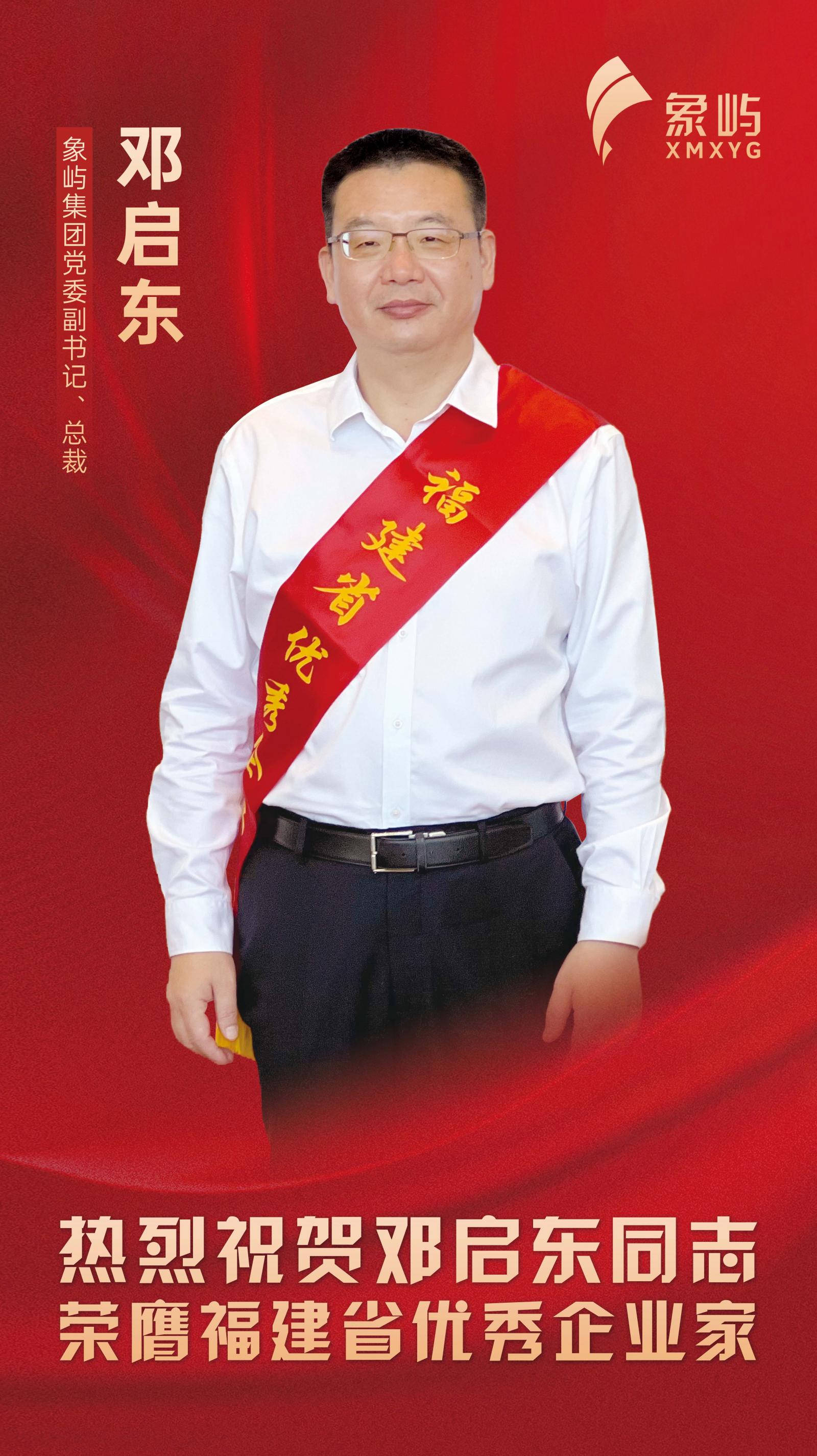 今天上午,第十九屆福建省優(yōu)秀企業(yè)家表彰大會在福州舉行,象嶼集團(tuán)黨委副書記、總裁鄧啟東榮膺福建省優(yōu)秀企業(yè)家。