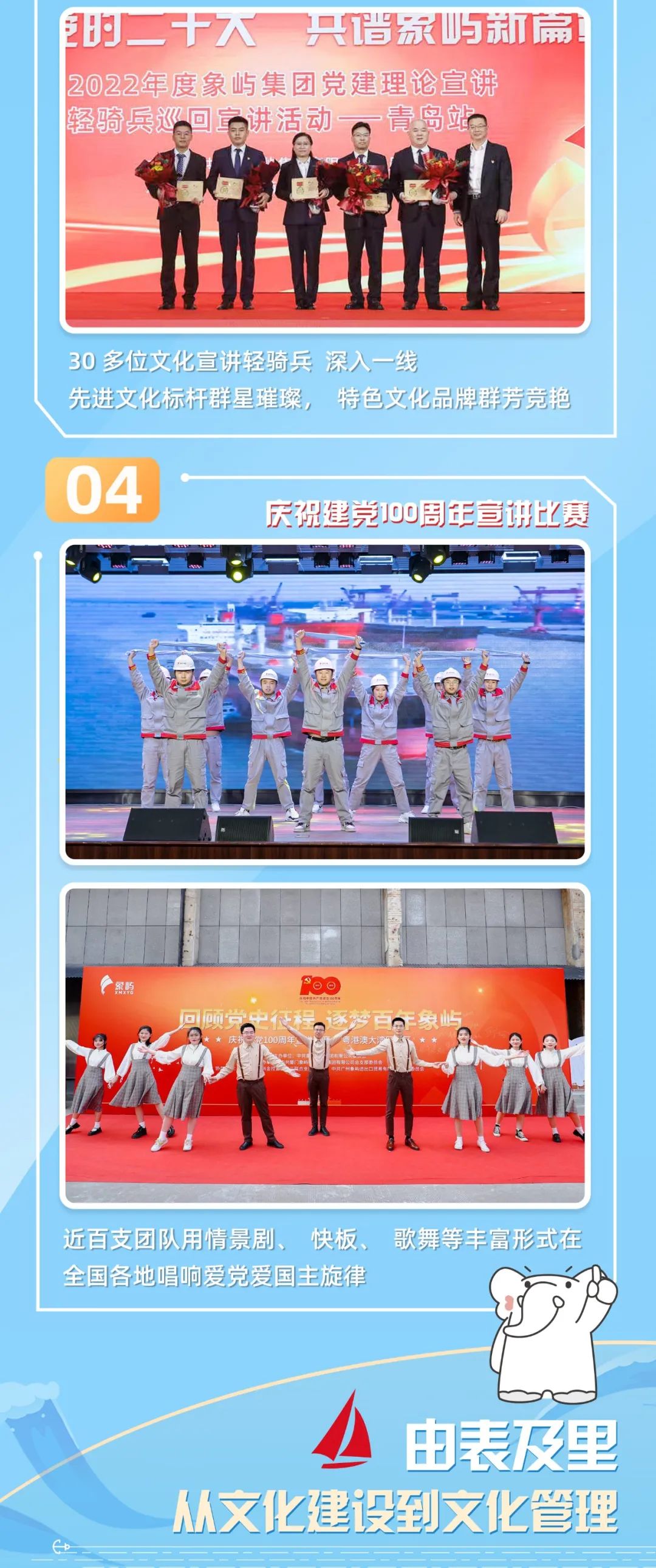 習(xí)近平總書記指出:“我們要堅(jiān)持道路自信、理論自信、制度自信,最根本的還有一個(gè)文化自信”“文化自信,是更基礎(chǔ)、更廣泛、更深厚的自信”。27年來,象嶼集團(tuán)始終堅(jiān)持黨的領(lǐng)導(dǎo),以創(chuàng)新開拓的特區(qū)精神投身于改革開放和市場經(jīng)濟(jì)的發(fā)展浪潮中,歷練出以堅(jiān)持市場化道路、堅(jiān)持風(fēng)險(xiǎn)第一等為核心的、蘊(yùn)含海洋基因的特色企業(yè)文化,為企業(yè)高質(zhì)量發(fā)展筑牢根基,提供強(qiáng)有力的精神動(dòng)能。